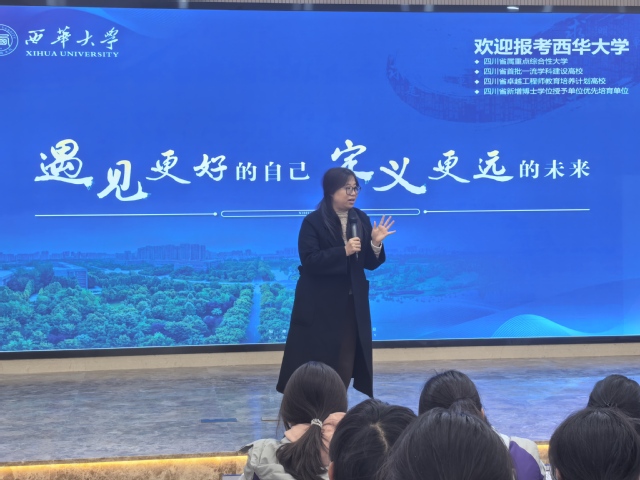 随后,方晴向在座师生开展了题为《遇见更好的自己定义更好的未来》主题宣讲,她鼓励南充高级中学的优秀学子树立远大理想,将自己的成长目标植根于祖国发展的沃土,同时介绍了西华大学的办学历史、师资力量、学科特色以及招生政策,欢迎南高学子在这里开始人生新的篇章。