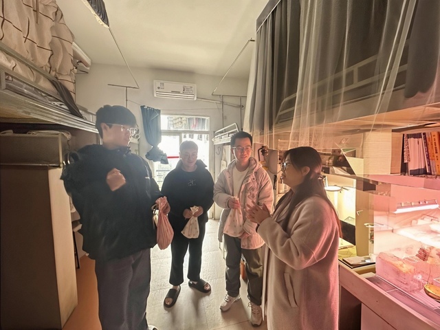 2025年12月11日中午,学院党委副书记方晴带领毕业生辅导员刘靓、陈姣走进学生宿舍,开展2022级考研学生专项慰问活动,为即将参加硕士研究生招生考试的学子送上慰问品与考前鼓励。