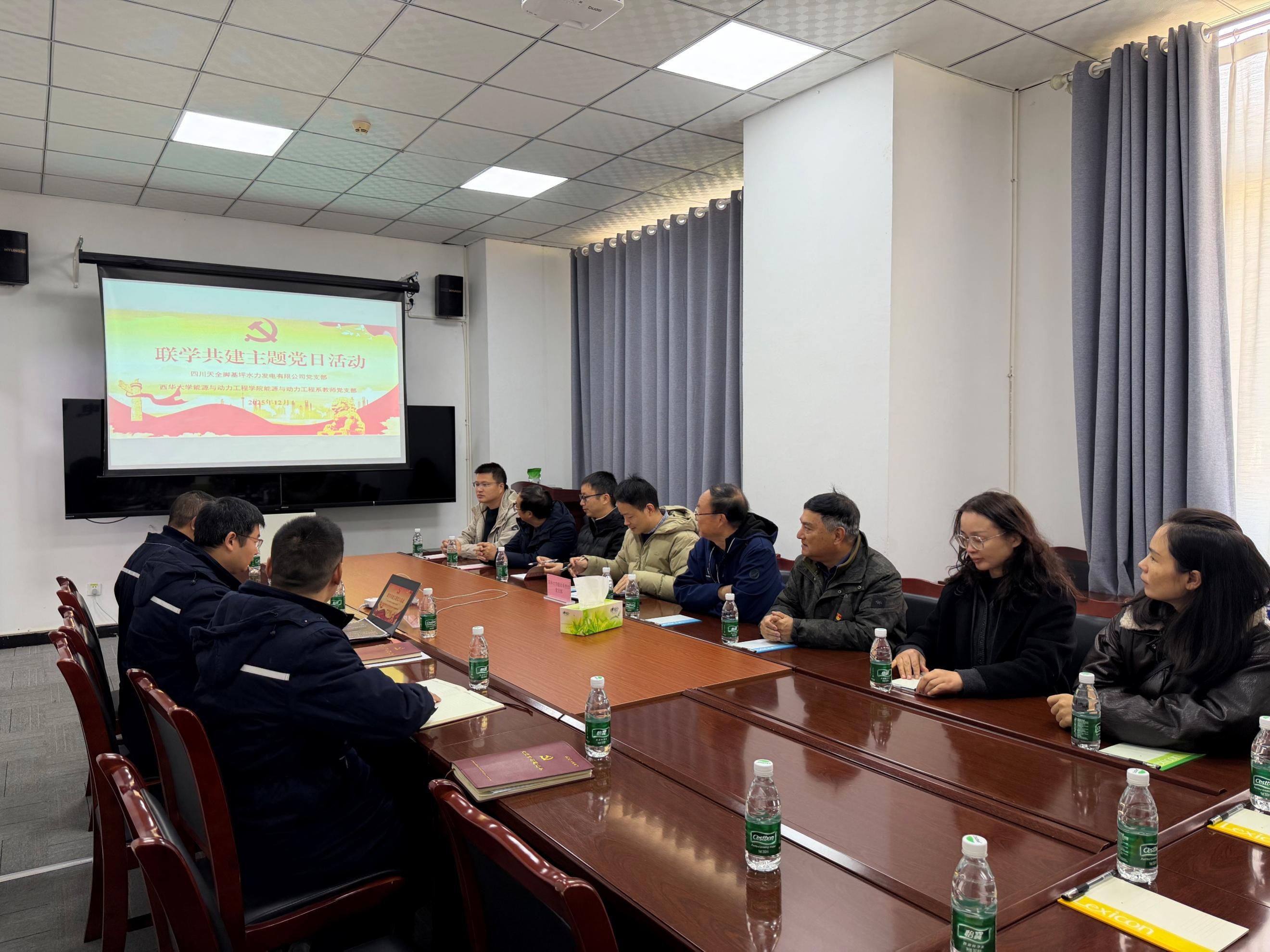 随后,双方围绕党建工作、人才培养、专业实践与技术创新等主题展开了深入交流。四川天全脚基坪水力发电有限公司党支部书记赵兵介绍了党建引领企业生产经营,特别是党建在促进地方经济发展、加强企地共建方面所取得的显著成效。能源与动力工程系教师党支部书记陈小明介绍了在党建引领下推进教学和科研融合发展的实践路径,特别是在“一融双高”建设背景下,学科建设、人才培养和科学研究等方面取得的阶段性成果。双方还就企业一线实践经验如何更好融入课程教学与实践教学体系进行了充分交流,并围绕构建产学研协同育人长效机制深入交换意见,着力为学生搭建更加贴近行业实际的学习资源与实践平台。