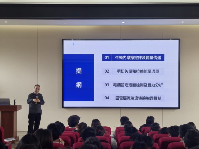 在讲座的核心部分,周怀春教授结合自己多年的科研积淀,深入浅出地分享了他在牛顿内摩擦定律及能量传递、剪切矢量和拉伸能量通量、毛细管弯月面检测及受力分析、圆管层流湍流转捩物理机制等方面的研究思路与创新成果: